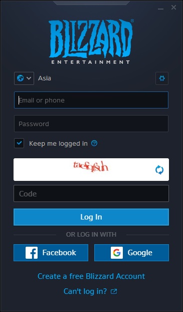 选择地区为“Asia”,登录您的国际战网通行证,输入CODE(图形验证码),点击“Log In”登录即可